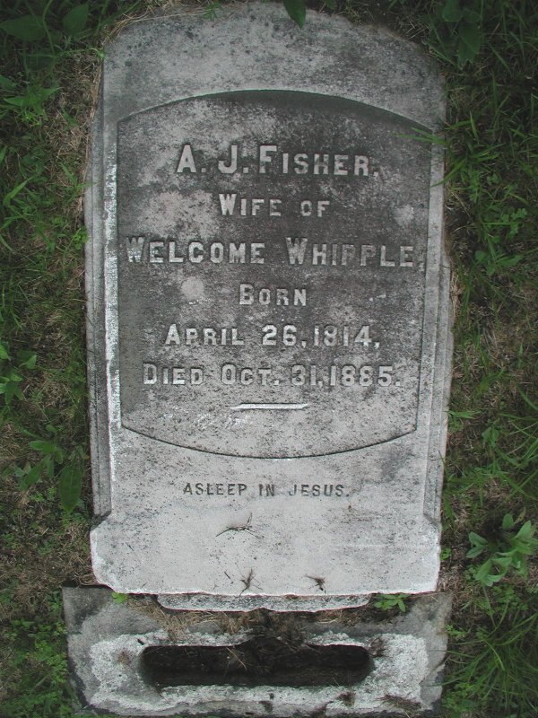 Submitted by Beth Hurd, 20 Jul 2004. A. J. Fisher, wife of Welcome Whipple, born April 26, 1814, died Oct. 31, 1885 Asleep in Jesus |