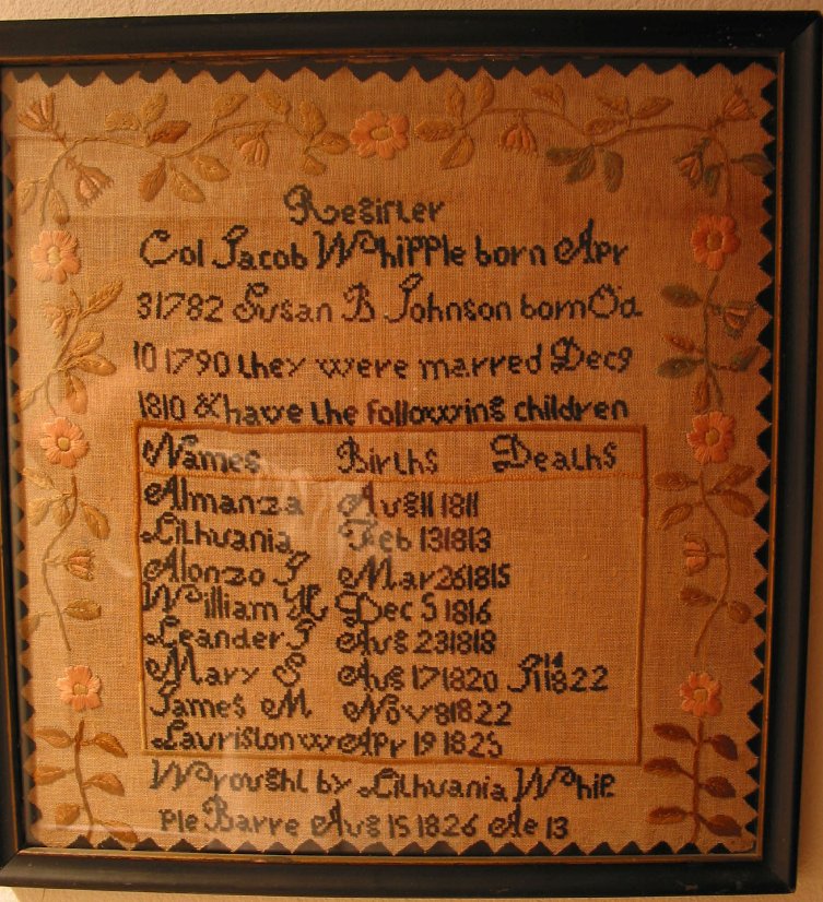!SOURCE: Sampler made by Lithuania Whipple in 1826 at age 13, listing vital information about her parents and siblings. Photo of sampler submitted to the Whipple Website by Connie Carlton (email hidden), 18 Jan 2002. Gives name Susan B. Johnson.