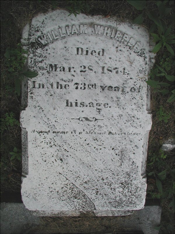 Submitted by Beth Hurd, 20 Jul 2004. William Whipple, died Mar. 28, 1874, in the 73rd year of his age A good name is a blessed .... (worn) |