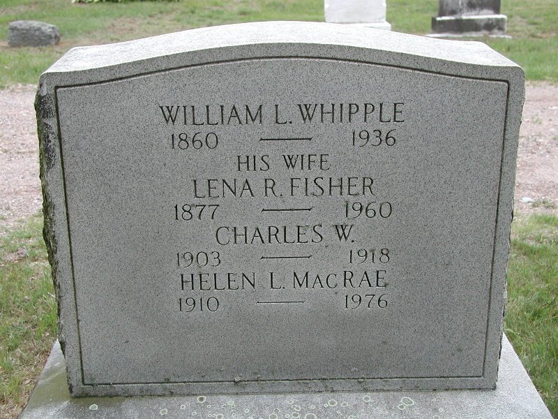 Gravestone of William L. and Lena R. (Fisher) Whipple, with Charles W. and with Helen L. MacRae |